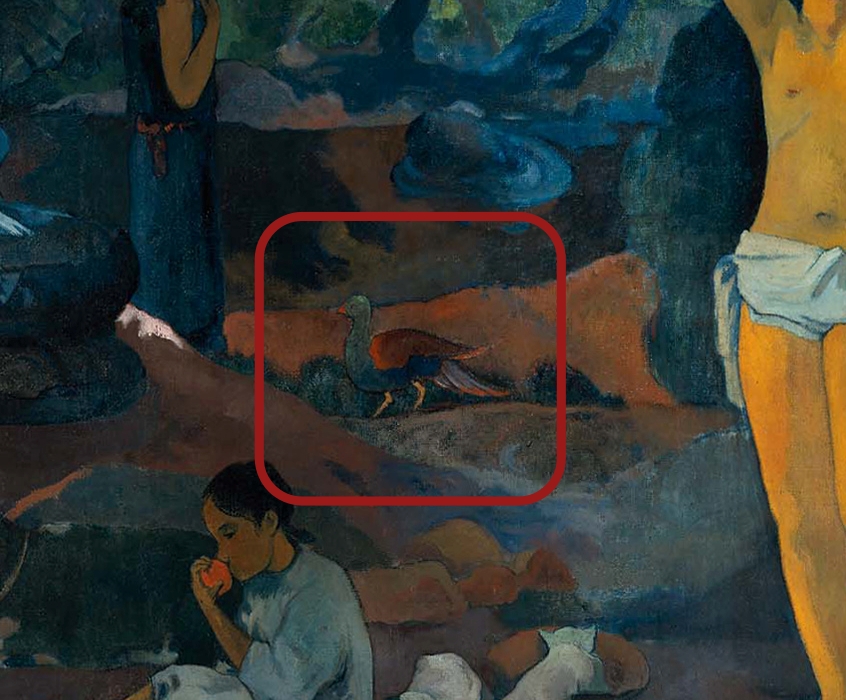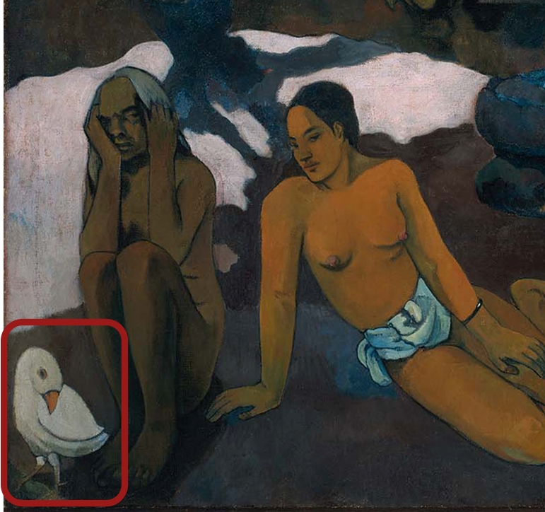 ゴーギャンは手紙の中で「その鳥(l’oiseau)は、この偉大なるすべてにおいて、劣等な存在と知的な存在を比較し、詩を完結させる。すべてはその題名に明示されている問題である」と残しています。