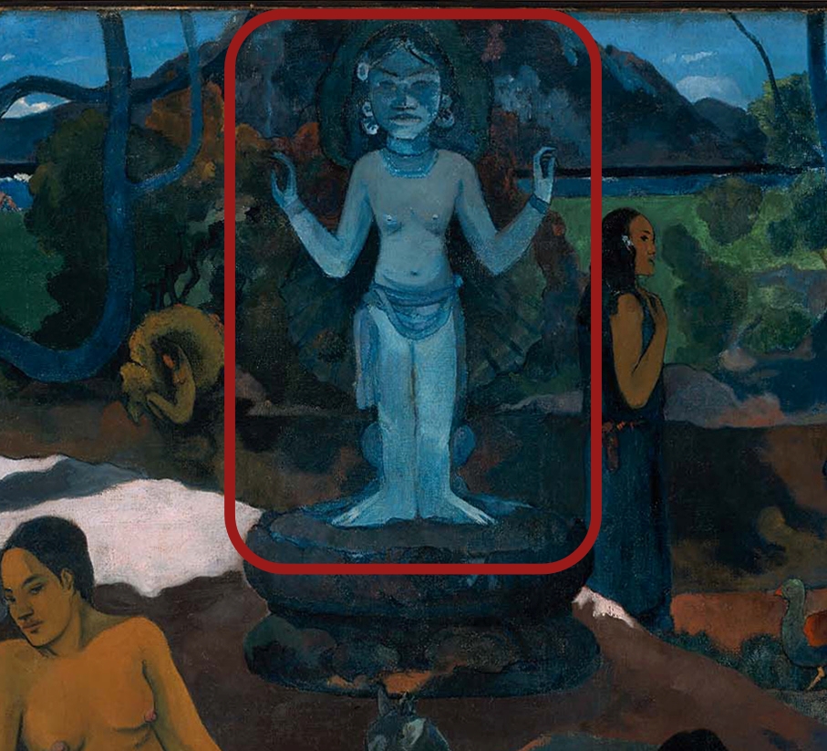 画面左上に佇む青白い偶像。両腕を差し上げ、どこか遠くを指し示すその姿は、この絵の中でもっとも謎めいた存在です。ゴーギャンはこの偶像について手紙にこう記しています。