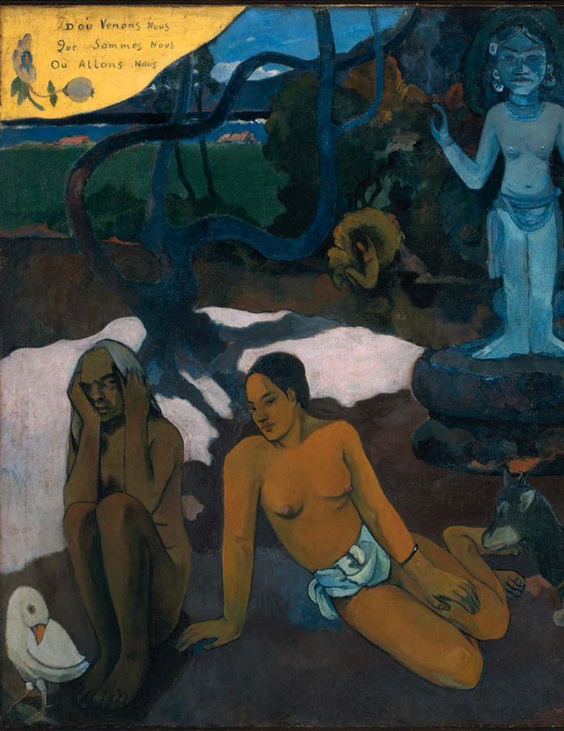 19世紀末のタヒチから届いたこのタイトル(署名)は、時代を越えて今も問いかけてきます。私たちはどこから来て、何者で、どこへ向かっているのでしょうか。