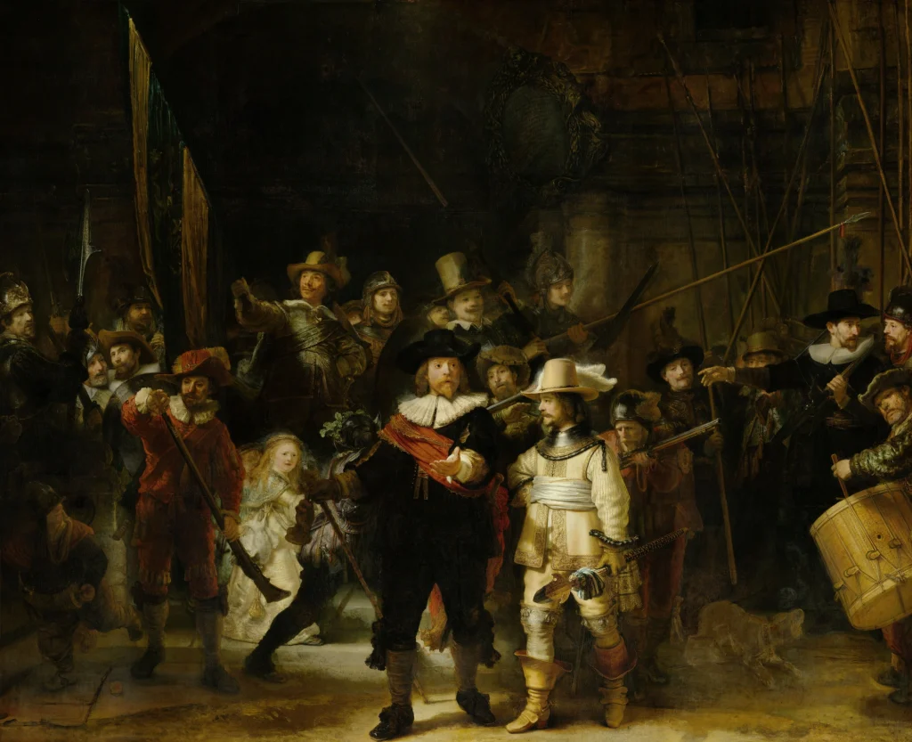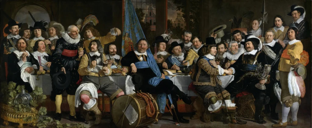この国民性が、集団肖像画という文化を育てました。仲間うちでお金を出し合い、全員を一枚の絵に描いてもらう——現代の集合写真に近い感覚です。17世紀のアムステルダムでは、ギルドや市民自警団がこぞって集団肖像画を発注していました。