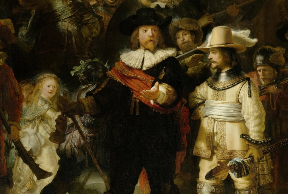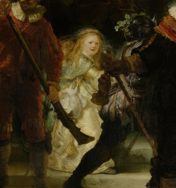 この場面を成立させているのが、レンブラント得意の明暗法「キアロスクーロ」です。強い光を特定の人物に当て、周囲を影で包むことで、隊長・副隊長・謎の少女の3人が自然と目に飛び込んでくる。