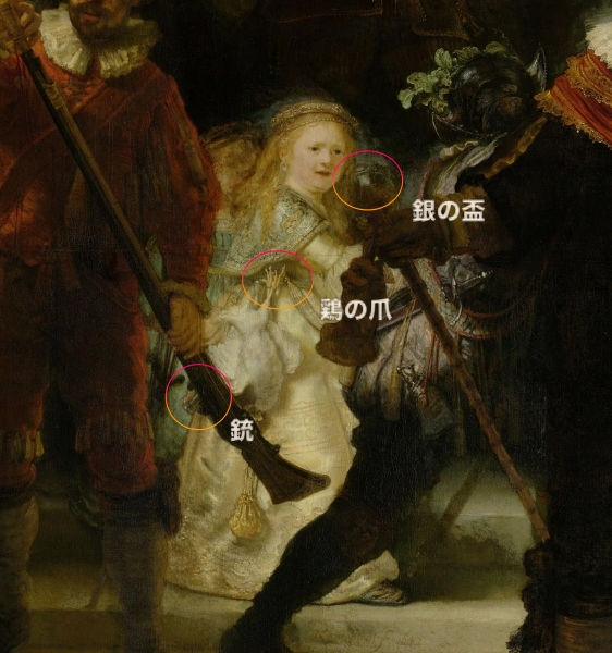 腰に下げた鶏の爪は、火縄銃手組合の紋章「鷹の爪」を暗示するもの。死んだ鶏は「撃ち倒された敵」の象徴でもあります。右手に持つ銀の盃は、組合の宴会で使われる杯。後ろに見える銃も、組合の特権である火器の所持を示しています。